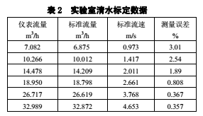 現(xiàn)場(chǎng)試驗(yàn)所用測(cè)量管的內(nèi)徑為DN50,通過(guò)高壓由壬接入泥漿管線,并串接渦輪流量計(jì)進(jìn)行比較,采用標(biāo)準(zhǔn)計(jì)量罐測(cè)試。計(jì)量鉆井泥漿密度范圍為1.15g/cm³~2.50g/cm³,固井設(shè)計(jì)施工現(xiàn)場(chǎng)一次性替漿量為18m³~160m³,替漿瞬時(shí)流量為0.2m³/min~2.8m³/min(流速:1.6~23.8m/s);通過(guò)近15口井的施工應(yīng)用,結(jié)果如表1所示。試驗(yàn)表明儀表計(jì)量誤差小于1%;在流速2.0m/s以下,隨著流量的減少測(cè)試誤差逐漸提高,在流速1.0m/s左右計(jì)量精度降到3%左右。經(jīng)分析,主要是由零點(diǎn)漂移引起的,這點(diǎn)與實(shí)驗(yàn)室用清水標(biāo)定結(jié)果基本吻合。使用DN50的測(cè)量管,實(shí)驗(yàn)室標(biāo)定結(jié)果如表2所示。試驗(yàn)證明,采用雙頻矩形波作為勵(lì)磁信號(hào),可有效地規(guī)避和抑止固井泥漿的流動(dòng)噪聲和現(xiàn)場(chǎng)震動(dòng)等所帶來(lái)的低頻噪聲,從而顯著提高儀表計(jì)量泥漿的精度。