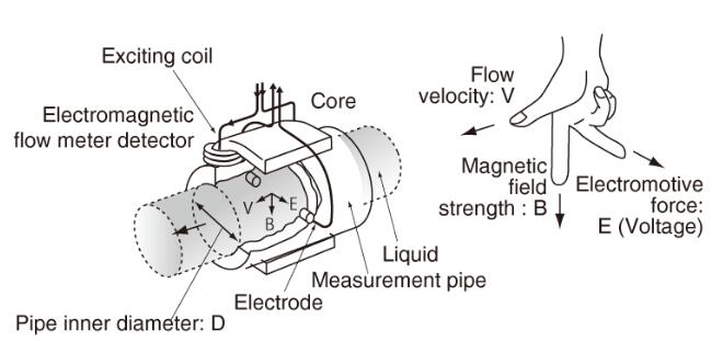 根據(jù)法拉*感應定律,在磁場內(nèi)移動導電液體會產(chǎn)生管內(nèi)徑,磁場強度和平均流速都成比例的電動勢(電壓)。換句話說,在磁場中移動的液體的流速被轉(zhuǎn)換成電力。(E正比于V×B×D)