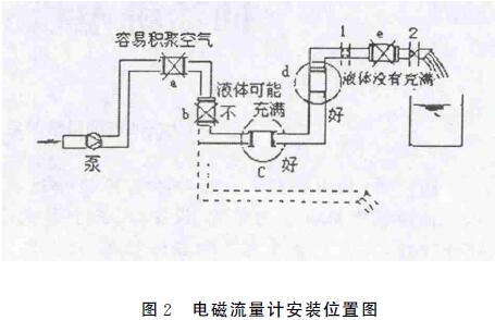 3.2.4對于電極可拆卸的儀表在安裝時(shí)方向錯(cuò)誤。部分污水流量計(jì)的電極并非安裝在表體測量管壁上,而是與表頭一體并可拆卸,在安裝時(shí)要注意兩個(gè)電極的連線應(yīng)與液體流向保持垂直。3.2.5液體未充滿管道,電極之間含有氣體。管道未充滿液體主要是管網(wǎng)工程設(shè)計(jì)或儀表安裝位置不當(dāng),使傳感器測量管內(nèi)不能充滿液體。應(yīng)避免安裝如圖所示a、e的位置和以虛線管排放時(shí)b位置,改裝到c,d位置較好。水平安裝時(shí)應(yīng)使電極的連線保持水平,如果電極一上一下,下部電極會(huì)由于介質(zhì)內(nèi)雜質(zhì)沉淀覆蓋電極,上部電極會(huì)由于氣泡堆積造成電極與介質(zhì)絕緣。垂直安裝時(shí)應(yīng)裝在流體自下而上流動(dòng)的管道上,這樣更容易使液體充滿管道。