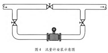 (6)安裝在工藝不允許流量中斷的管道時,應(yīng)考慮儀表的清洗和維護,應(yīng)安裝旁通管道(如圖4)。