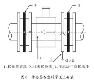 (2)傳感器在塑料管道上或在絕緣襯里的管道上安裝時,如圖6,傳感器兩端必須安裝接地環(huán)或接地法蘭。使管內(nèi)流動的被測介質(zhì)與大地短路,具有零電位,否則污水流量計無法正常工作。