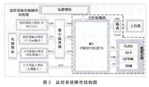 現(xiàn)場浮子流量計監(jiān)控系統(tǒng)的總體結(jié)構(gòu)如圖2所示。其中硬件系統(tǒng)主要功能是模擬量(溫度、儀表信號)的采集,模擬量(4~20mA 電流)的輸出,開關(guān)量的輸入輸出以及遠(yuǎn)距離RS485串行通訊和數(shù)據(jù)存儲。其中監(jiān)測系統(tǒng)硬件結(jié)構(gòu)如圖3 所示。為增強監(jiān)測系統(tǒng)的抗干擾能力, 本設(shè)計采用帶隔離的電源模塊以及數(shù)字隔離器確保系統(tǒng)能夠高效穩(wěn)定工作。