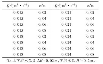 有限水域的浮體結(jié)構(gòu)在不同來流動(dòng)水中運(yùn)行時(shí),浮體結(jié)構(gòu)位置的改變會(huì)對(duì)流場(chǎng)產(chǎn)生影響,從而影響浮體結(jié)構(gòu)的泄流能力以及穩(wěn)定性。試驗(yàn)過程中固定浮體結(jié)構(gòu)的體型不變(長(zhǎng)L=0.20m,寬B=0.30m,高a=0.10m),分別選取4種不同來流流量Q及浮體結(jié)構(gòu)位置e,控制浮體結(jié)構(gòu)在上、下游水位不變的條件下進(jìn)行試驗(yàn),具體試驗(yàn)參數(shù)設(shè)計(jì)及說明見表1以及圖2。