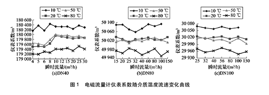 由圖1可得:( 1)隨著介質(zhì)溫度的升高,廢水流量計(jì)的儀表系數(shù)均呈逐漸降低的趨勢。其中20℃和50℃的儀表系數(shù)基本相同,10℃和80 0C的儀表系數(shù)與20℃時偏離較大。(2)溫度對廢水流量計(jì)的儀表系數(shù)在高溫以及低溫處影響明顯,以D N40廢水流量計(jì)為例,儀表系數(shù)本次實(shí)驗(yàn)高低溫處*大變化量約為0. 7% o ( 3)在廢水流量計(jì)相應(yīng)的流量范圍內(nèi),在同一溫度下,隨著介質(zhì)流速的變化,廢水流量計(jì)的儀表系數(shù)在個別點(diǎn)出現(xiàn)略微浮動,但整體變化不超過1 0. 2 %。