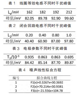 仿真試驗(yàn)中,設(shè)定線圈等效電感取值范圍為 162~212mH,間隔 10mH;閉合回路等效電感范圍 0.2~1mH,間隔為 0.2mH;雙電層電容、接觸電阻隨流體電導(dǎo)率變化而變化,電導(dǎo)率增大接觸電阻和雙電層電容減小而電荷傳遞電阻增大??稍O(shè)定電極接觸電阻、雙電層電容和電荷傳遞電阻范圍分別為 5~15kΩ、10~20μF 和50~60Ω,由公式(7)知,可用 T2 表示上述三者關(guān)系。 仿真參數(shù)取值不同情況下,通過 MATLAB 工具箱對仿真測量得到的干擾峰值進(jìn)行曲線擬合畫出相應(yīng)的曲線圖。 其中仿真數(shù)據(jù)和相對應(yīng)的曲線方程如表 1~表 4 所示,曲線圖如圖 4~圖 6。