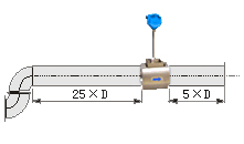 若傳感器安裝點(diǎn)的上游在同一平面上有二個(gè)90°彎頭,傳感器上游應(yīng)有不小于25D的等徑直管段,下游應(yīng)有不小于5D的等徑直管段。
