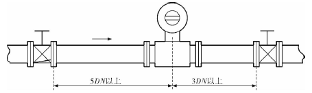 工業(yè)鹽水流量計的安裝質(zhì)量對其測量結(jié)果的影響較大,因此在安裝時需要注意幾個問題。*先,工業(yè)鹽水流量計直管段的選擇在配管時一定要按照要求進行選擇,一般選擇流量計通徑與工藝管道通徑相同,即可滿足工程需要,而且安裝方便、壓力損失小,流量計直管段上游側(cè)的長度不少于5倍工藝管道直徑,下游側(cè)的長度不少于3倍工藝管道直徑(圖2)。但在流速太慢而又要求精度較高或需要變徑的應(yīng)用場合,可選擇通徑小于工藝管道通徑的流量計,以提高測量精度,此時流量計上、下游必須加裝異徑管,且進口異徑管上游側(cè)應(yīng)有長于10倍工藝管道直徑的直管段,下游側(cè)應(yīng)有長于5倍工藝管道直徑的直管段(圖3)。