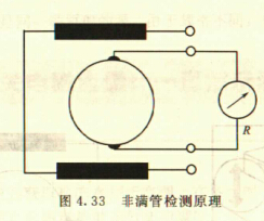 非滿管檢測也是基于電導率檢側(cè)的方法。在圖4.33所示的電磁流量傳感器中,增加了一個(或一對)非滿管檢測電極。當導管內(nèi)液體滿管時,頂部電極與其他電極之間的電阻值很小;而當存在非滿管情況時,頂部電極與導電液體之間有氣體阻隔,所以電極電阻顯著增大,從而做出非滿管判斷。