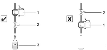 4.2.2 安裝位置。安裝在閥門(mén)附近,灌裝流量計(jì)不能安裝在控制閥的下游(圖6),如果裝在控制閥的下游,在一個(gè)灌裝周期結(jié)束后,傳感器的測(cè)量管道完全排空,這樣會(huì)嚴(yán)重影響下個(gè)周期的測(cè)量。
