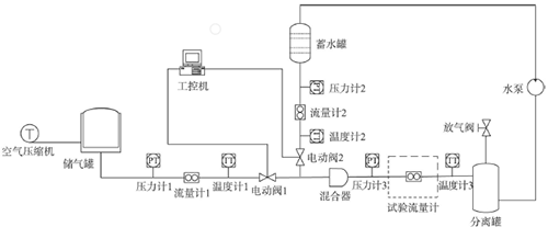 空氣壓縮機(jī)將空氣壓縮后送入儲(chǔ)氣罐,標(biāo)準(zhǔn)流量計(jì)1計(jì)量氣液混合前儲(chǔ)氣罐送入管道的氣體流量。蓄水罐距離地面30m,提供試驗(yàn)所需的液相,其流量由標(biāo)準(zhǔn)流量計(jì)2測得。液相和氣相經(jīng)混和器混和后送入試驗(yàn)管段,*后流入分離罐將水和空氣進(jìn)行分離,空氣由放氣閥排出,水由水泵送回蓄水罐循環(huán)使用。工控機(jī)對(duì)所有儀表數(shù)據(jù)進(jìn)行采集和顯示并對(duì)兩個(gè)電動(dòng)調(diào)節(jié)閥進(jìn)行控制,調(diào)節(jié)氣相和液相的流量。