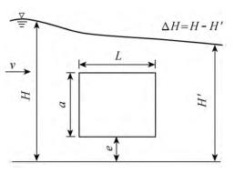 有限水域的浮體結(jié)構(gòu)在不同來流動(dòng)水中運(yùn)行時(shí),浮體結(jié)構(gòu)位置的改變會(huì)對(duì)流場(chǎng)產(chǎn)生影響,從而影響浮體結(jié)構(gòu)的泄流能力以及穩(wěn)定性。試驗(yàn)過程中固定浮體結(jié)構(gòu)的體型不變(長(zhǎng)L=0.20m,寬B=0.30m,高a=0.10m),分別選取4種不同來流流量Q及浮體結(jié)構(gòu)位置e,控制浮體結(jié)構(gòu)在上、下游水位不變的條件下進(jìn)行試驗(yàn),具體試驗(yàn)參數(shù)設(shè)計(jì)及說明見表1以及圖2。