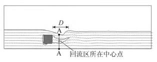 來自上游的水體經(jīng)浮體結(jié)構(gòu)的阻擋作用,水流繞流經(jīng)浮體結(jié)構(gòu)的上部和下部區(qū)域通過,并在浮體結(jié)構(gòu)背水面的下游區(qū)域形成小范圍回流區(qū),此處水流紊亂,流速分布不均勻。試驗(yàn)過程中,對(duì)回流區(qū)沿水流方向的長(zhǎng)度D(水槽縱向中心斷面處,自浮體結(jié)構(gòu)背水面到沿水流方向流速為0的*遠(yuǎn)位置點(diǎn))進(jìn)行量測(cè)。選取浮體結(jié)構(gòu)下游區(qū)域回流區(qū)中心點(diǎn)所在斷面進(jìn)行流速測(cè)量對(duì)比。流速測(cè)量斷面位置A-A見圖3。