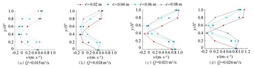 由圖5可知,當(dāng)e相同時(shí),斷面*小流速發(fā)生的位置相同,發(fā)生在浮體結(jié)構(gòu)下游回流區(qū)位置。隨著來流流量的增大,流經(jīng)浮體結(jié)構(gòu)下泄的水流流速在上層和下層水體中呈現(xiàn)增大的趨勢(shì)。浮體結(jié)構(gòu)位置不變,由于受到浮體結(jié)構(gòu)的擠壓,上游來流分別經(jīng)過浮體結(jié)構(gòu)上部、下部進(jìn)行泄流,因此在下游區(qū)域的上層、下層水體中,流速較大;受浮體結(jié)構(gòu)的阻擋,浮體結(jié)構(gòu)下游區(qū)域形成回流區(qū),流速較小。試驗(yàn)過程中,由于控制浮體結(jié)構(gòu)所在水域的上游、下游水位不發(fā)生變化,因此隨著來流流量的增大,流速呈現(xiàn)增大的趨勢(shì)。
