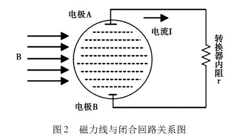 2. 1 正交干擾衛(wèi)生型卡箍電磁流量計的磁路系統(tǒng)包含有兩個勵磁線圈,而導管內(nèi)的液體與傳感器電極及轉換器結構組成了一個閉合的回路,如圖2 所示。理論情況下,磁力線( 圖中B) 應與閉合回路相平行,但是由于裝配過程中的誤差,導致磁力線不可能完全平行于這一閉合回路,出現(xiàn)部分磁力線成一定角度穿過回路的現(xiàn)象,這引起了即使沒有液體流動的情況下,傳感器的電極上也會產(chǎn)生感應電動勢,就形成了正交干擾的基本形式。