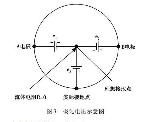 在被測液體與電極和接液部件接觸過程中,電解質中的正負離子會分別作定向運動,這會使被測液體在電極和接液部件之間形成電位差,通常將這種現(xiàn)象稱為極化現(xiàn)象。如圖3 所示,理論上來說,兩電極A 和B 對接液部件的電位e1、e2大小相等、方向相反,此時兩電極的電位差等于零。但是,若兩電極的材質或表面狀態(tài)存在差異,此時A、B 電極之間的電位差就不為零,這就形成了極化電壓,極化電壓與共模狀態(tài)的電壓e3一起疊加在流量信號中,被輸入轉換器的差動放大器。當極化電壓過大,則會對差動放大器的輸入端造成較大影響,導致信號無法放大或流量信號的輸出波動過大,從而降低了衛(wèi)生型卡箍電磁流量計的測量精度。