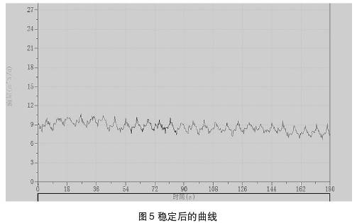 圖4、圖5中所示曲線為測量過程中所截取的集流傘中所聚集的氣相,通過排氣通道排出時(shí)與排出后的測量曲線。測試過程中錄取到的儀器排氣的過程,當(dāng)集流傘完全支開后仍需要開啟流量測試進(jìn)行實(shí)時(shí)檢測,否則可能會錄取資料失真。