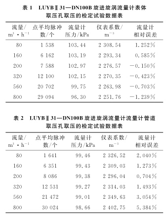 以使用廣泛的DN100B天燃?xì)饬髁坑?jì)為例,系統(tǒng)運(yùn)行時(shí)間為60s,標(biāo)準(zhǔn)裝置的滯止平均溫度為28.9℃,空間平均濕度為30%,流量計(jì)的平均溫度為28.3℃,在表體取壓孔取壓和管道取壓孔取壓的流量計(jì)檢定試驗(yàn)數(shù)據(jù)分別如表1、2所示。