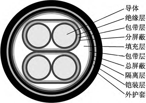 該新型電纜的結(jié)構(gòu)如圖1所示。導體為單股退火鍍錫軟銅線,以提高導體的導電性和防腐蝕性。在導體外繞包一層?。疲矗ň鬯姆蚁┌雽щ妿В欣诮档蛯w和絕緣之間的摩擦起電噪音。絕緣采用材料較為純凈、介電常數(shù)較小、具有一定彈性的聚丙烯絕緣級材料,并采用擠壓式擠出,減小絕緣層與導體的間隙。采用對絞組作為信號傳輸線,由于在兩根傳輸線上感應的電壓接近相等,減小了電壓差值,提高了信號傳輸穩(wěn)定性;對絞組由兩種不同顏色絕緣線芯組成,相鄰線對對絞節(jié)距應不大于100mm。對絞分屏蔽組(即對對絞組進行分屏蔽,每對對絞組外繞包兩層聚酯帶和一層厚0.04mm鋁塑復合帶繞包,內(nèi)置一根7×0.26mm鍍錫銅絞線作引流線)有利于對不同對絞組之間信號串音的抑制和隔離。對絞分屏蔽組同心式絞合成纜,在對絞分屏蔽組間填充非吸濕性材料,以保證纜芯圓整。在成纜纜芯外繞包兩層聚酯帶,再采用鋁塑復合帶繞包,內(nèi)置鍍錫銅線作引流線,以提高電纜電磁屏蔽能力??偲帘螌油鈹D包隔離層(隔離護套),隔離層采用絕緣級低密度聚乙烯材料。隔離層外采用鎧裝層,鎧裝材料為高導磁合金鋼帶,其為強磁材料,可將外來的磁通大部分限制在鎧裝層的外表面上(僅有少部分能進入被屏蔽的空間);鎧裝時對高導磁合金鋼帶采用縱包焊接,確保其形成一連續(xù)圓柱管;鎧裝層可提高電纜抗電磁干擾水平以及對電纜進行加強,減少電纜振動引起的電動勢。外護套采用藍色軟PVC(聚氯乙烯)護層級電纜材料擠包,實現(xiàn)電纜防護。