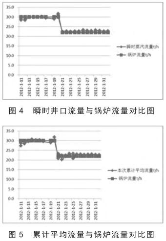 從繪制的散點(diǎn)曲線(xiàn)圖中可以看出,流量計(jì)的瞬時(shí)流量、瞬時(shí)干度基本能夠代表累計(jì)流量和累計(jì)干度,二者之間誤差較小 ;瞬時(shí)流量與累計(jì)流量曲線(xiàn)均與鍋爐流量曲線(xiàn)一致 ;瞬時(shí)干度與累計(jì)平均干度曲線(xiàn)稍低于鍋爐干度,瞬時(shí)流量對(duì)比誤差與本次累計(jì)流量對(duì)比誤差曲線(xiàn)趨勢(shì)一致,瞬時(shí)干度對(duì)比誤差與本次累計(jì)平均干度誤差圖曲線(xiàn)趨勢(shì)一致。將瞬時(shí)值對(duì)比能夠代表累計(jì)值對(duì)比,二者平均誤差在 0.3%,大部分誤差在 3% ;單井累加流量值與鍋爐流量累加值平均誤差在 2% 以?xún)?nèi),且分布較穩(wěn)定,沒(méi)有大的波動(dòng) ;單井干度平均值與鍋爐干度平均值誤差在 8% 以?xún)?nèi)。說(shuō)明現(xiàn)場(chǎng)安裝的氬氣流量計(jì)能夠準(zhǔn)確的計(jì)量蒸汽流量和干度,能夠較好的適應(yīng) SAGD 高干度蒸汽計(jì)量的要求。