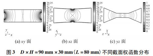 4) 圖 3( c) 、圖 4( c) 的 yz 面權(quán)函數(shù)分布表明,D = 90 mm時(shí)的權(quán)函數(shù)等勢線間距略大于 D = 60 mm 時(shí)的權(quán)函數(shù)等勢線間距,權(quán)函數(shù)變化梯度較小,且中心區(qū)域的權(quán)函數(shù)等勢線逐漸變?yōu)橹本€,因此 D = 90 mm 的權(quán)函數(shù)分布更均勻一些,但是兩者區(qū)別很小,即寬度改變對(duì) yz 面權(quán)函數(shù)分布影響很小。圖 4( c) 、圖 5( c) 的 yz 面權(quán)函數(shù)分布表明,H = 30 mm時(shí)的權(quán)函數(shù)等勢線間距較大,且中心區(qū)域的權(quán)函數(shù)等勢線逐漸變?yōu)橹本€,因此 H = 30 mm 的權(quán)函數(shù)分布更加均勻;