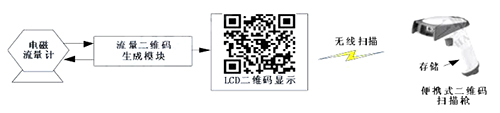 二維碼生成模塊定時向管道式電磁流量計發(fā)送采集指令,后者收到指令后發(fā)送流量數(shù)據(jù)。