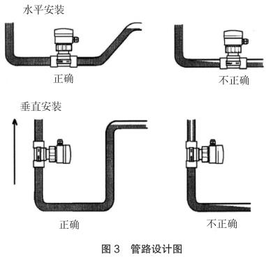 現(xiàn)場安裝時應(yīng)注意遠(yuǎn)離可能對其產(chǎn)生干擾的大型設(shè)備,防止長期的熱輻射和其他如磁場直射等環(huán)境影響。為確保高測量精度和較好的零點穩(wěn)定性,進行校正前,高壓電磁流量計應(yīng)裝入工藝介質(zhì)中至少 24 小時電極鈍化。安裝的管路設(shè)計應(yīng)確保管道始終充滿流體,防止測量誤差,管路設(shè)計圖見圖 3。