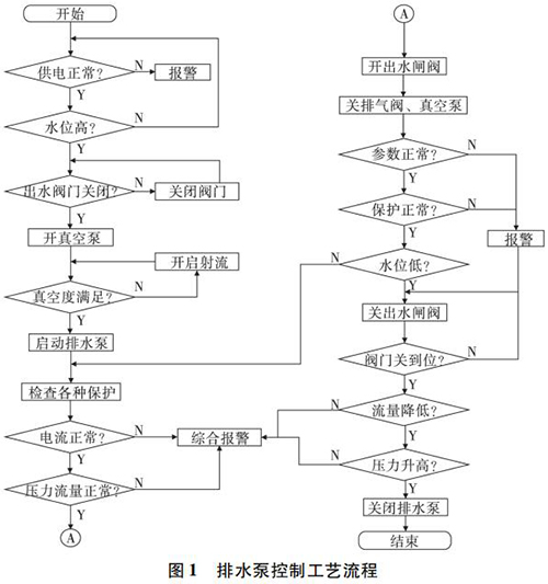排水泵進行自動化控制模式后,當水倉水位達到開泵要求,PLC 自動檢測電動閥門、球閥、供電電壓等是否正常后,啟動真空泵進行抽真空,當水泵真空度符合開泵要求時便啟動排水泵。排水泵正常運轉(zhuǎn)后 PLC 時時收集運行數(shù)據(jù)進行比對,當發(fā)現(xiàn)運行數(shù)據(jù)比對出現(xiàn)差異時影響到排水泵正常運轉(zhuǎn)時,會發(fā)出停泵命令。排水泵控制工藝流程如圖 1 所示。