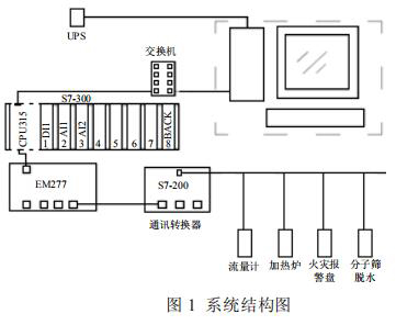 集氣站是收集氣井所生產(chǎn)天然氣的站場(chǎng),在集氣站內(nèi)對(duì)天然氣進(jìn)行節(jié)流降壓、加熱、調(diào)壓計(jì)量等各種工藝預(yù)處理,設(shè)備眾多且分散。為方便進(jìn)行檢測(cè)和操作,必須進(jìn)行統(tǒng)一的數(shù)據(jù)采集,在監(jiān)控臺(tái)進(jìn)行數(shù)據(jù)的管理。集氣站設(shè)備主要包括加熱爐、高壓型電磁流量計(jì)、分子篩、火災(zāi)報(bào)警盤(pán),以及供電設(shè)備 UPS 等,這些不同廠家的設(shè)備基本都支持Modbus 協(xié)議,通過(guò) Modbus 通訊可以將這些數(shù)據(jù)采集。為了有效降低成本,設(shè)計(jì)了如圖 1 所示的系統(tǒng)。系統(tǒng)采用西門(mén)子 S7-300 控制器,通過(guò)以太網(wǎng)連接上位機(jī)監(jiān)控軟件,再通過(guò) MP277 連接S7-200 的方式。S7-200 控制器自帶 RS485 接口,能夠進(jìn)行 Modbus 通訊,采集現(xiàn)場(chǎng)各種設(shè)備數(shù)據(jù)。*后通過(guò)以太網(wǎng)通訊將設(shè)備數(shù)據(jù)上傳至監(jiān)控軟件,方便操作人員進(jìn)行監(jiān)控,該方案簡(jiǎn)單有效,能夠?qū)崿F(xiàn)集氣站內(nèi)設(shè)備的狀態(tài)監(jiān)控,數(shù)據(jù)處理,有效的進(jìn)行天然氣的生產(chǎn)工作。