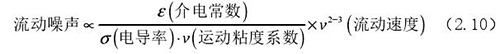 流動噪聲主要出現(xiàn)在低電導率流體的檢測中,由輸出端輸出的直流極化電壓時常出現(xiàn)左右擺動的現(xiàn)象,而此種擺動的電壓被稱為流動噪聲。上式(2.5)中可以觀察了解到流體電導率和流動噪聲呈現(xiàn)出負相關關系,由此可以了解到在進行低電導率的計算中需要重點考慮位移電流。