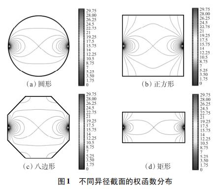 為考察不同異徑截面權(quán)函數(shù)分布的均勻性,使用上述方法對圓形、正方形、八邊形和矩形異徑截面的權(quán)函數(shù)分布進行定性分析。為了便于對比,設(shè)置管道口徑為DN100,異徑部分截面積為3200mm2。所以,圓形異徑面半徑為32mm,正方形異徑面邊長為56.6mm,八邊形異徑面邊長為25.8mm,矩形異徑面長寬為80×40mm。仿真結(jié)果如圖1所示,為了便于對比,權(quán)函數(shù)等勢線大小從0開始,以0.25為步長遞增到30。由圖1(a)~圖1(d)可知,矩形異徑截面的權(quán)函數(shù)等勢線間距*大,即權(quán)函數(shù)變化梯度*小,權(quán)函數(shù)分布*均勻。