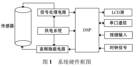高頻勵磁煤焦油流量計由傳感器、高頻勵磁電路、信號處理電路等組成,其中高頻勵磁電路決定著傳感器磁場的強(qiáng)弱,勵磁電路的穩(wěn)定性以及精確性決定著系統(tǒng)檢測的準(zhǔn)確性以及穩(wěn)定性。DSP 系統(tǒng)控制勵磁電路激勵傳感器線圈,當(dāng)線圈中有導(dǎo)電液體流過時,其切割磁感線并在傳感器兩端的線圈上產(chǎn)生感應(yīng)電動勢,利用信號檢測電路監(jiān)測感應(yīng)電動勢的大小,*后根據(jù)相應(yīng)關(guān)系計算出液體的流量,系統(tǒng)硬件框圖如圖 1 所示。