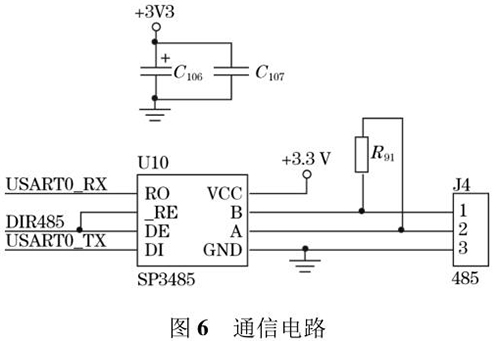 煤焦油流量計輸出的流量值可以通過外接的 TFTLCD 屏直接顯示,還可以通過預(yù)留的 RS485 通信接口將數(shù)據(jù)發(fā)送到上位機(jī)中。RS485 電路*大的優(yōu)點(diǎn)是 485 電平與 TTL 電平兼容,方便與 TTL 電路相連;抗共模干擾能力強(qiáng);數(shù)據(jù)傳輸速度快,高達(dá) 10 Mbps;通信距離遠(yuǎn),*大為 1.2 km。系統(tǒng)采用 SP3485 芯片進(jìn)行數(shù)據(jù)通信,SP3485 是一款低功耗芯片且符合RS485 協(xié)議的收發(fā)器,電路圖如圖 6 所示。