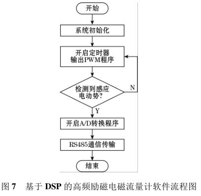 軟件流程圖如圖7 所示。軟件采用模塊化的設(shè)計方法,主要設(shè)計了勵磁控制切換程序、PWM 波產(chǎn)生程序、A/D 轉(zhuǎn)換程序以及 RS485 通信程序等。系統(tǒng)上電后*先執(zhí)行復(fù)位操作,利用 DSP 內(nèi)部的定時器產(chǎn)生PWM 波控制 H 橋電路中的勵磁方式,當(dāng)系統(tǒng)檢測到傳感器線圈輸出的感應(yīng)電動勢后,利用 DSP 內(nèi)部的 12位 A/D 轉(zhuǎn)換器對此信號進(jìn)行模數(shù)轉(zhuǎn)換,*后根據(jù)相應(yīng)算法計算出管道中被測液體的流量。