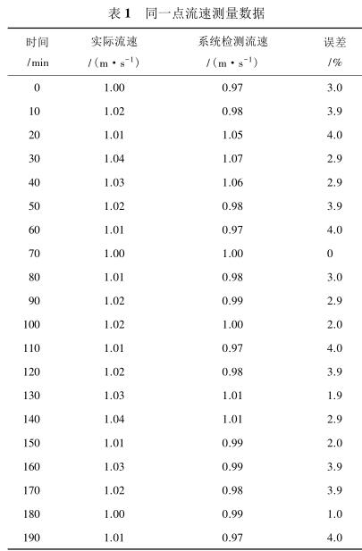 實驗中使用管道的管徑為標(biāo)準(zhǔn) 50 mm,連續(xù)檢測管道中同一點(diǎn)的流量,每 10 min 記錄一次數(shù)據(jù),對比數(shù)據(jù)的差異,以此來判定系統(tǒng)測量的穩(wěn)定性。*先對管道中的流量進(jìn)行標(biāo)定,利用標(biāo)準(zhǔn)流量計進(jìn)行檢測,通過改變閥門開度來調(diào)整管道中液體流量,流量標(biāo)定為 1 m/s,此時啟動系統(tǒng)開始檢測,數(shù)據(jù)如表 1 所示。