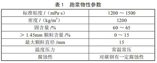 對跑漿進行分析后發(fā)現(xiàn),跑漿是一種由煤漿和一些雜質(zhì)混合而成的半流體物質(zhì),當甲烷流量計使用煤倉中煤堆中上部煤時,由于煤質(zhì)較好,跑漿中小煤塊極少,性質(zhì)同正常煤漿,只是固含量稍高;而使用煤堆底部的煤時,煤質(zhì)差甲烷流量計研磨不充分,跑漿中含有約 15% 的小煤塊,分析后的跑漿物質(zhì)參數(shù)如表 1 所示。