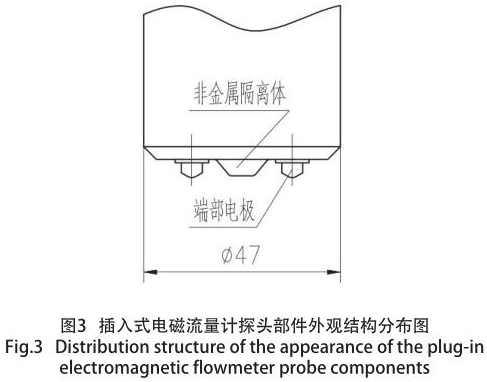 通過(guò)大量的試驗(yàn),對(duì)探頭端部外型結(jié)構(gòu)亦采用特殊設(shè)計(jì),從而消除兩個(gè)電極之間的擾流現(xiàn)象,同時(shí)亦消除因通電產(chǎn)生磁場(chǎng),導(dǎo)致兩個(gè)電極吸附介質(zhì)中的鐵屑而影響測(cè)量精度和死區(qū)效應(yīng),增強(qiáng)了輸出信號(hào)的穩(wěn)定性,從而提高傳感器準(zhǔn)確度和抗干擾性。通過(guò)結(jié)構(gòu)的優(yōu)化設(shè)計(jì),使用壽命更長(zhǎng),dn80泥漿流量計(jì)探頭局部,如圖 3 所示。