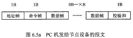 在測水流量計等節(jié)點設(shè)備和C機通信的過程中,由地址幀、命令幀、數(shù)據(jù)幀、校驗和可組成各種功能不同的報文。由于采用主從工作方式來實現(xiàn)通信,測水流量計等節(jié)點設(shè)備僅能接收并執(zhí)行PC機發(fā)送來的控制命令,而不能發(fā)送命令給PC機。因此,由PC機發(fā)往流量計等節(jié)點設(shè)備的報文一般包括一個地址幀,一個命令幀,若干個數(shù)據(jù)幀和一個校驗和,其報文格式圖.6a5所示;而由流量計等節(jié)點設(shè)備發(fā)往PC機的報文一般包括一個地址幀,若干個數(shù)據(jù)幀和一個校驗和,其報文格式如圖6.5b所示。