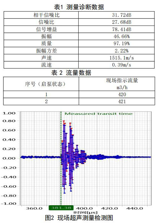 在高負(fù)荷段采用泵送補(bǔ)給水狀態(tài):測(cè)試時(shí)間 2018年10月11日,采用德國FLUEX高精度外夾式超 聲波流量計(jì)作為標(biāo)準(zhǔn)流量計(jì),測(cè)量基礎(chǔ)數(shù)據(jù):管道 外徑276.93mm,管壁厚度12.40mm,采用兩聲程169mm傳感器安裝距離,通過對(duì)超聲波流量計(jì)信號(hào) 分析與診斷(數(shù)據(jù)見表1、表2和圖2),診斷數(shù)據(jù) 提示標(biāo)準(zhǔn)超聲波流量計(jì)測(cè)量狀況佳,檢測(cè)開始,啟 動(dòng)補(bǔ)給水泵,運(yùn)行一段時(shí)間流量穩(wěn)定后,測(cè)量結(jié)果 如下: