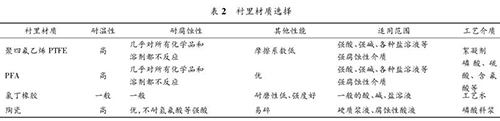 防腐型電磁流量計(jì)要根據(jù)被測(cè)流體的溫度、壓力、速度以及含固顆粒的硬度、含量和粒徑大小來決定測(cè)量管內(nèi)襯的材質(zhì)。該濕法磷酸裝置中,防腐型電磁流量計(jì)測(cè)量管襯里材質(zhì)的種類見表 2。