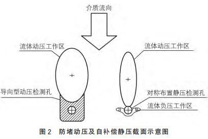 新二氧化氯流量計(jì)采用拋物面導(dǎo)向型結(jié)構(gòu)作為動(dòng)壓測(cè)點(diǎn),采用對(duì)稱自補(bǔ)償型式的靜壓測(cè)點(diǎn),可以有效地解決來流方向偏流時(shí)信號(hào)的穩(wěn)定采集,來流偏離管道軸線時(shí),可以維持輸出差壓基本不變,如圖2所示。
