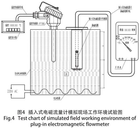 其原因是:勵(lì)磁線圈的阻值及匝數(shù)是按照常溫狀態(tài)下進(jìn)行設(shè)計(jì)的,而含有勵(lì)磁線圈的煤層注水流量計(jì)經(jīng)常是高于常溫狀態(tài)下進(jìn)行安裝、使用(如:高爐回水、供熱管道等),勵(lì)磁線圈的阻值隨使用環(huán)境溫度的變化而變化,致使煤層注水流量計(jì)測量時(shí)的準(zhǔn)確度大為降低,性能的不確定性大為增加,為了保證儀表的高準(zhǔn)確度和穩(wěn)定性,在不同的季節(jié)(主要是環(huán)境溫度和介質(zhì)溫度),經(jīng)過大量模擬現(xiàn)場實(shí)際情況的試驗(yàn),并結(jié)合轉(zhuǎn)換器的技術(shù)參數(shù)要求,得出一個(gè)完善的勵(lì)磁線圈各種技術(shù)參數(shù)。模擬現(xiàn)場試驗(yàn)裝置如圖 4 所示。