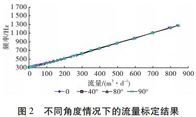 為了考察井眼斜度變化對硫酸銅流量計測量流量的影響,開展了非集流硫酸銅流量計在不同斜度情況下的流量測量模擬實驗。模擬實驗在大慶油田多相流實驗室進(jìn)行,儀器外徑 38 mm,模擬井筒內(nèi)徑為 124 mm,實驗介質(zhì)是水,傾斜角度分別為 0°、40°、80°和 90°( 水平) ,流量范圍為 5 ~ 850 m3 /d。實驗結(jié)果表明,在儀器居中條件下,井眼斜度變化對硫酸銅流量計的儀表常數(shù)沒有影響,滿量程誤差不大于 4% ,因此可以應(yīng)用硫酸銅流量計進(jìn)行水平井注水剖面測量。不同角度情況下的實驗結(jié)果如圖 2 所示。