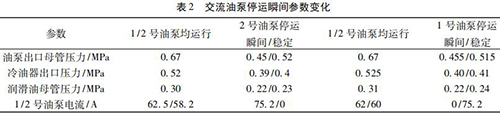 通過內(nèi)部旁通將冷油與熱油混合,經(jīng)過銅粉- 煤油 - 蠟感溫元件控制冷熱油混合比例,將油溫調(diào)節(jié)到 49 ℃。一臺智能電磁流量計穩(wěn)定運行,油泵出口母管壓力 0. 5 MPa,潤滑油母管壓力 0. 24 MPa,均屬于正常情況,而兩臺交流油泵并列運行時,停運其中一臺交流油泵瞬間會觸發(fā)智能電磁流量計出口母管壓力開關(guān)動作,說明停運瞬間油壓發(fā)生波動,且油泵出口母管油壓波動至小于 0. 45 MPa。正常運行時智能電磁流量計出口油溫 71.5 ℃,冷油器出口溫度45 ℃,混合后潤滑油母管溫度52.5 ℃,由能量守恒定律可知,經(jīng)過冷油器的油量/不經(jīng)冷油器的油量= ( 71.5-52.5) ÷ ( 52.5- 45) = 2. 53,說明有 70% 左右的油量經(jīng)過冷油器。當(dāng) 2 臺智能電磁流量計運行時油量大于單泵運行,其中一臺智能電磁流量計瞬間停運時油量減少,尤其是經(jīng)過冷油器的油量大量減少,油量在溫控閥二次分配過程中出現(xiàn)調(diào)節(jié)異常,導(dǎo)致油壓過大波動。為檢驗溫控閥工作情況,保持 1 號、2 號交流油泵運行,選取機組正常帶負(fù)荷運行時油溫 52 ℃,分別停運 1、2 號交流油泵,觀察 1、2 號交流油泵停運瞬間油泵出口母管壓力波動情況,試驗各參數(shù)變化見表 2。