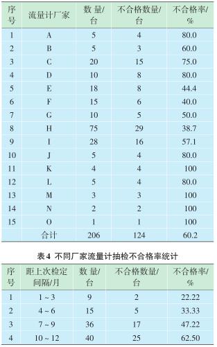 2018年選取100臺氣體流量計按照其檢定后的使用時間進行了統(tǒng)計,其不合格率統(tǒng)計見表4。從表4中可以看出,5個月之后流量計的使用誤差出現較大偏差,檢定不合格率明顯增加。