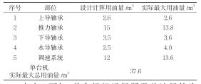 由表1可知,單臺機(jī)組運(yùn)行所需總油量約為37.6m3,其中各軸承所需油量約為24m3,均超出設(shè)計(jì)計(jì)算總油量。機(jī)組運(yùn)行所需總油量超出一個運(yùn)行油桶的總?cè)莘e,至少需用2個油桶來盛放。為保證機(jī)組各軸承用油和調(diào)速系統(tǒng)用油的油品質(zhì)量,機(jī)組排油時將各軸承所用透平油(約為24m3)排至一個運(yùn)行油桶中,將調(diào)速系統(tǒng)所用透平油(約為13.6m3)排至另一個運(yùn)行油桶中,避免混合造成油質(zhì)化驗(yàn)指標(biāo)不滿足用油設(shè)備的要求。