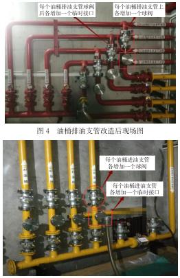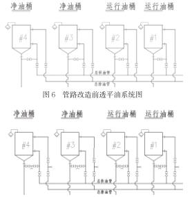 (1)改造后,各個油桶的油處理工作實(shí)現(xiàn)互不影響的效果。油桶排油支管的臨時接口兩端的球閥都是近油桶側(cè)的閥門,油桶進(jìn)油支管的臨時接口ding部的球閥為近油桶側(cè)的閥門。油桶需進(jìn)行油過濾工作時,僅需將濾油機(jī)的進(jìn)油管接在該油桶排油支管新增的臨時接口上,同時濾油機(jī)的出油管連接在該油桶進(jìn)油支管新增的臨時接口上,然后分別打開進(jìn)油支管和排油支管新增臨時接口ding部的近油桶側(cè)球閥,即可開始形成循環(huán)油路進(jìn)行油桶內(nèi)的透平油過濾。同時未改變各個油桶中透平油的互相倒換、轉(zhuǎn)移功能。