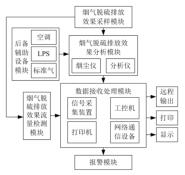根據(jù)功能設(shè)計(jì)的循環(huán)流化床dn150渦街流量計(jì)煙氣脫硫排放效果監(jiān)測(cè)系統(tǒng)包括煙氣脫硫排放效果采樣模塊、煙氣脫硫排放效果分析模塊、煙氣脫硫排放效果流量檢測(cè)模塊以及數(shù)據(jù)接收處理模塊、報(bào)警模塊、后備輔助設(shè)備模塊等六大模塊,具體結(jié)構(gòu)如圖1 所示。