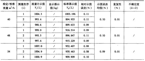 表1是用容積法現(xiàn)場(chǎng)檢測(cè)流量計(jì)后,電腦自動(dòng)生成的原始記錄數(shù)據(jù)頁部分,表2是用質(zhì)量法現(xiàn)場(chǎng)檢測(cè)流量計(jì)后,電腦自動(dòng)生成的原始記錄數(shù)據(jù)頁部分。