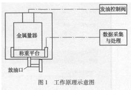 本裝置采用容積法和稱重法相結(jié)合的工作原理。對(duì)于質(zhì)量流量計(jì),采用稱量法直接比較,確定流量計(jì)的誤差。上裝放油閥防溢出控制系統(tǒng),采用液位動(dòng)態(tài)監(jiān)視,一旦超過容器安全液位高度,即可切斷發(fā)油動(dòng)力。在運(yùn)輸防震或非測(cè)量狀態(tài)時(shí),對(duì)秤進(jìn)行與稱重容器的脫離操作,保證稱重的可靠性。在稱重狀態(tài)時(shí),需要對(duì)枰進(jìn)行調(diào)平和清零,此部分采用動(dòng)態(tài)水平的方式進(jìn)行,即以水平位一致的方法調(diào)整稱重平臺(tái)。工作原理如圖1所示。