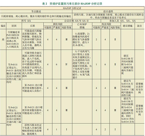 焚燒爐裝置排污單元在下列Ⅳ級風(fēng)險、Ⅲ級風(fēng)險沒有核實(shí)整改完成之前運(yùn)行存在較大風(fēng)險。如表 2 所示,污泥濃縮池、離心脫水機(jī)、脫水污泥的儲存料倉和污泥輸送泵輸送節(jié)點(diǎn)中,存在 2個參與風(fēng)險等級在Ⅲ級以上的問題:1)當(dāng) P-0111正常運(yùn)行,P-0131 備用泵輸送含油污泥且出口誤倒至活性污泥三通線時,泵 P-0111 出口堵死導(dǎo)致泵憋壓損壞,可能造成人員傷亡,風(fēng)險等級為Ⅲ;2)當(dāng) P-0121 正常運(yùn)行,P-0131 備用泵輸送活性污泥且出口誤倒至含油污泥三通線時,泵 P-0121出口堵死導(dǎo)致泵憋壓損壞,可能造成人員傷亡,風(fēng)險等級為Ⅲ。